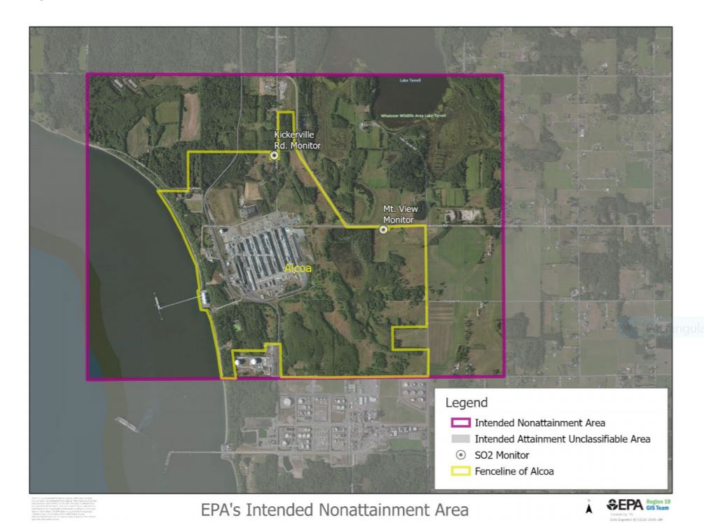 On Dec. 21, 2020, EPA designated a small portion of Whatcom County that includes the Intalco smelter as being in nonattainment of the federal standard.